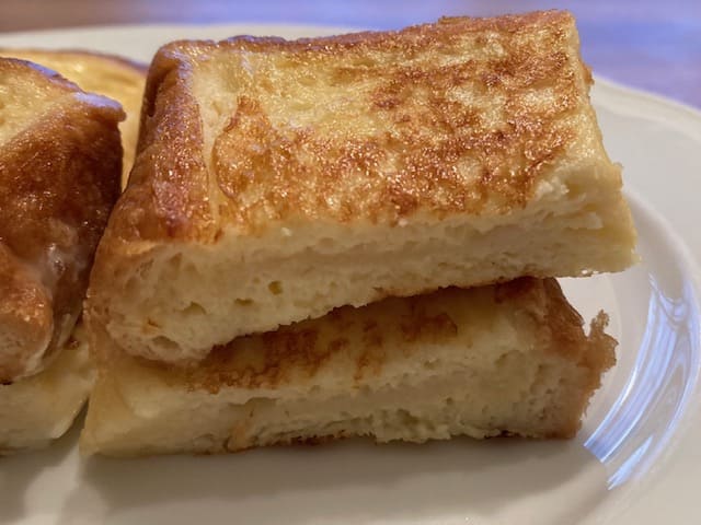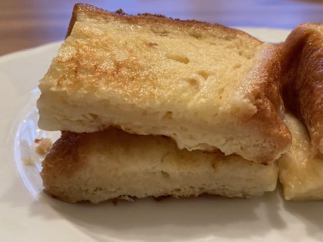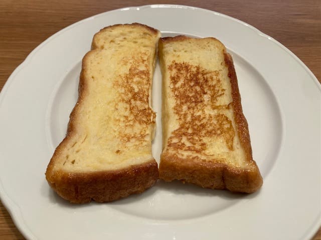 一方、角型食パンは中まで卵液がしみ込みやすいのか、全体的にトロトロ。口に入れるとじゅわっと広がり、とろけるような口当たりが楽しめます。やわらかくて優しい食感なので、小さなお子さんにも食べやすそうだと感じました。